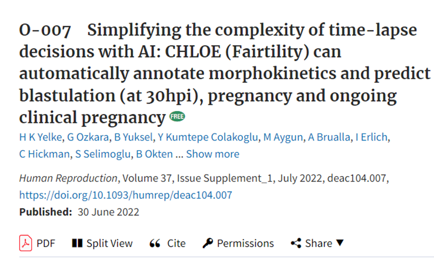 [3]HKYelke,GOzkara,BYuksel,:CHLOE(Fairtility)canautomaticallyannotatemorphokineticsandpredictblastulation(at30hpi),pregnancyandongoingclinicalpregnancy,HumanReproduction,Volume37,IssueSupplement_1,July2022,,