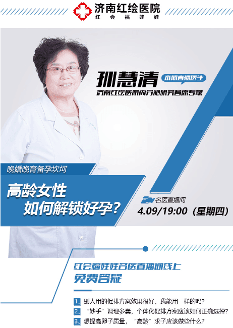 女性高龄也易多发多囊卵巢综合征,多囊卵巢综合征是育龄妇女常见的一种复杂的内分泌以及代谢异常所导致的疾病,主要临床表现为月经不规律、不孕、多毛和或痤疮,是常见的女性内分泌性疾病。济南红绘医院孙慧清主任作为内分泌研究首席专家,十分擅长治疗女性多囊卵巢综合症引起的不孕,其精湛的医术让许多患者顺利抱上了“红会福娃娃”,圆上了“家庭幸福梦”。4月9日(周四)晚19:00孙慧清主任将开启红会福娃娃|名医直播间线上课堂,针对高龄女性比较关心的孕育问题进行全方位、多视角解答。届时,参与直播的观众可以以文字留言的方式与专家进行互动,也可以与专家进行一对一连线问诊,不出门,在家即可看病!你可以致电或添加微信号:,询问参与直播事宜或咨询问诊不孕不育的相关问题。