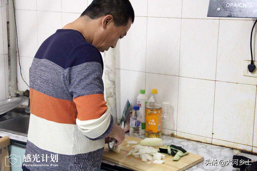 2012年末,刘宝福的父亲直肠癌复发并且转移变成肝癌和肺癌,2013年2月与世长辞。“那时候孩子刚刚学会说话,还没叫一声爷爷,老父亲就走了。但是我父亲是含笑走的,他没有遗憾。可是我作为儿子,情绪低落了很久。”刘宝福说,子欲养而亲不在的悲伤,迟迟消散不了,直到妻子提醒他还有母亲需要照顾,他才振作起来,告诉自己要珍惜活着的每个家人。图为刘宝福在医院旁的出租房给儿子和妻子做饭。