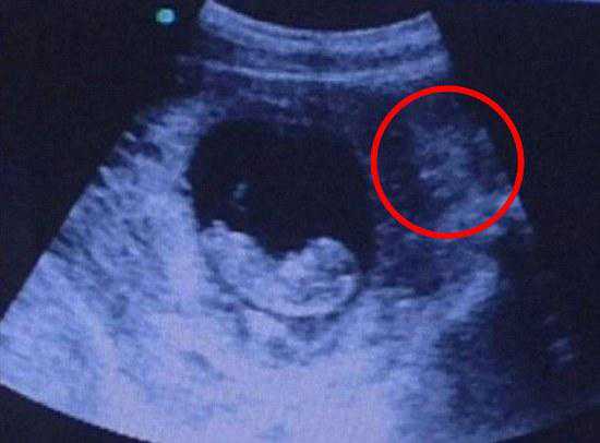 照片中,胎儿已初具人形,而右上角的胎盘等组织,看上去像是一个阴森恐怖的“恶魔”正在母亲子宫外注视着这个胎儿。