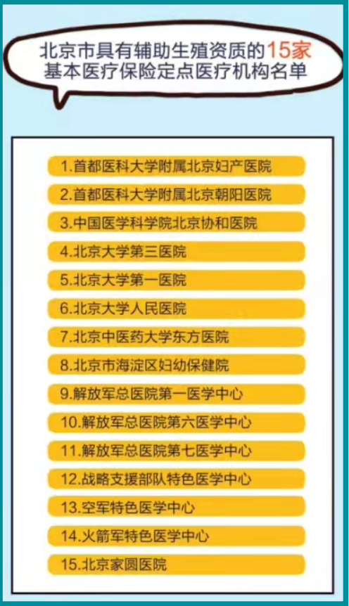 目前,北京具有辅助生殖资质的基本医疗保险定点医疗机构共有15家。包括首都医科大学附属北京妇产医院、首都医科大学附属朝阳医院和中国医学科学院北京协和医院等。
