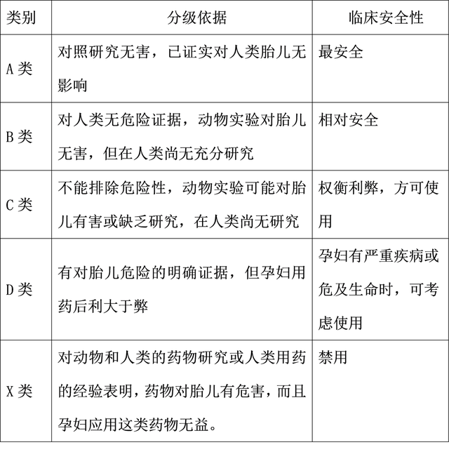 美国食药监管理局(FDA)对孕期用药做了几种分类,可以作为孕期用药的指南。这也是目前国内用以指导临床用药的参考依据,并要求制药企业应在药品说明书上按A、B、C、D、X5个级别标明。